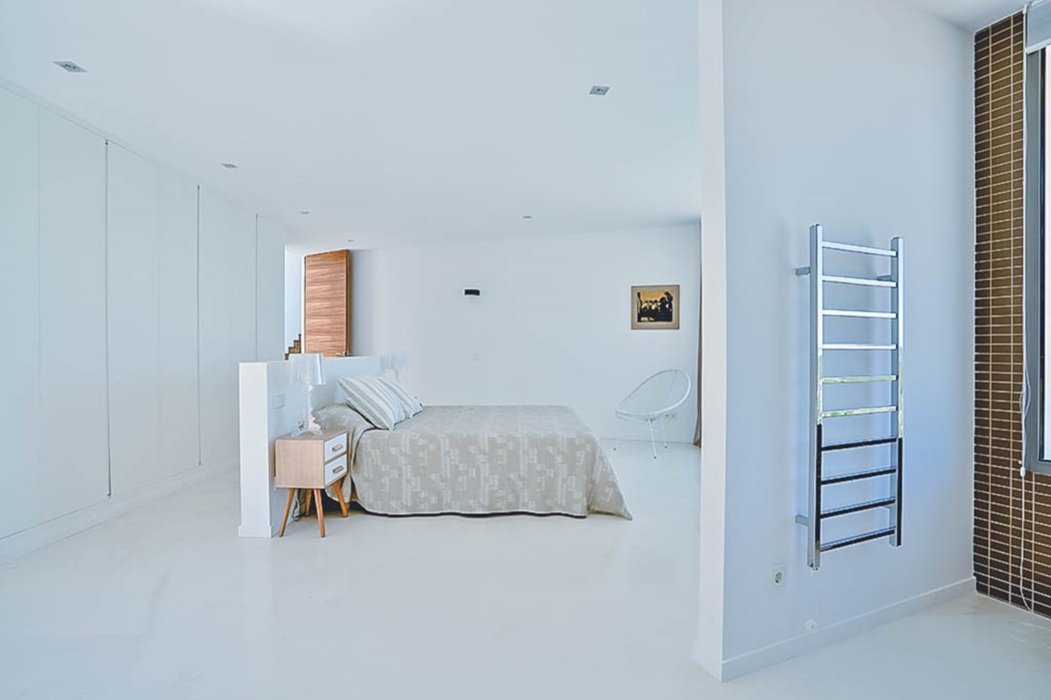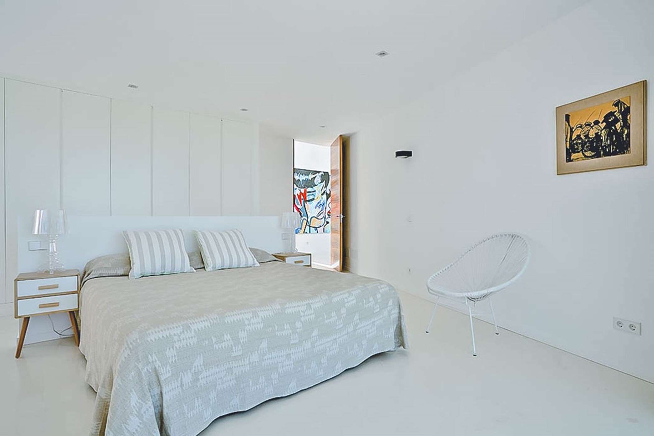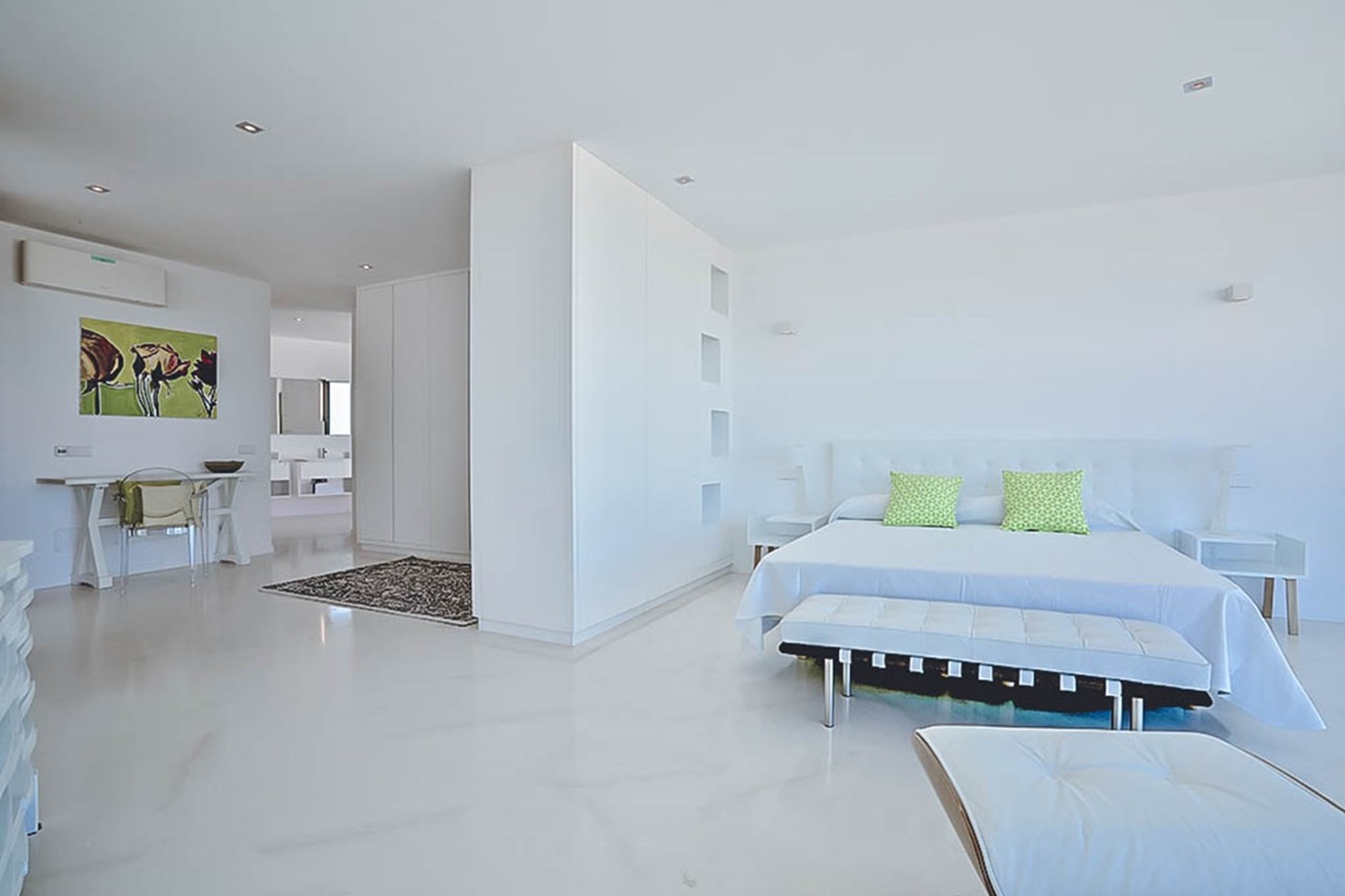The villa’s thoughtful design ensures that each space is both functional and luxurious. The master suite occupies the entire top floor, offering the ultimate in privacy and comfort. This spacious retreat features a private terrace that provides panoramic sea views, stretching all the way to Formentera, making it the perfect spot to watch the sun set over the horizon. The room is designed with meticulous attention to detail, offering a sanctuary of relaxation. Each of the other four bedrooms is equally opulent, complete with its own en-suite bathroom, offering guests the utmost comfort, privacy, and tranquility.