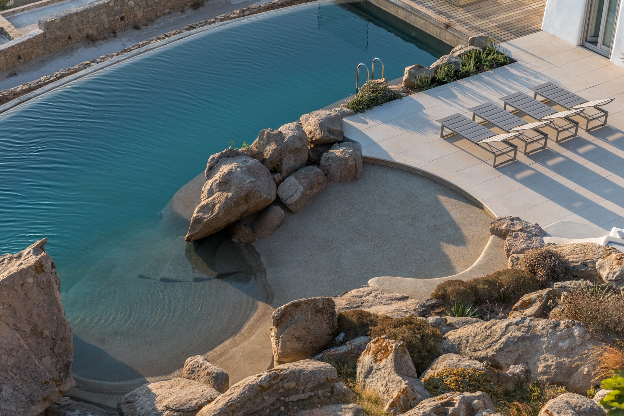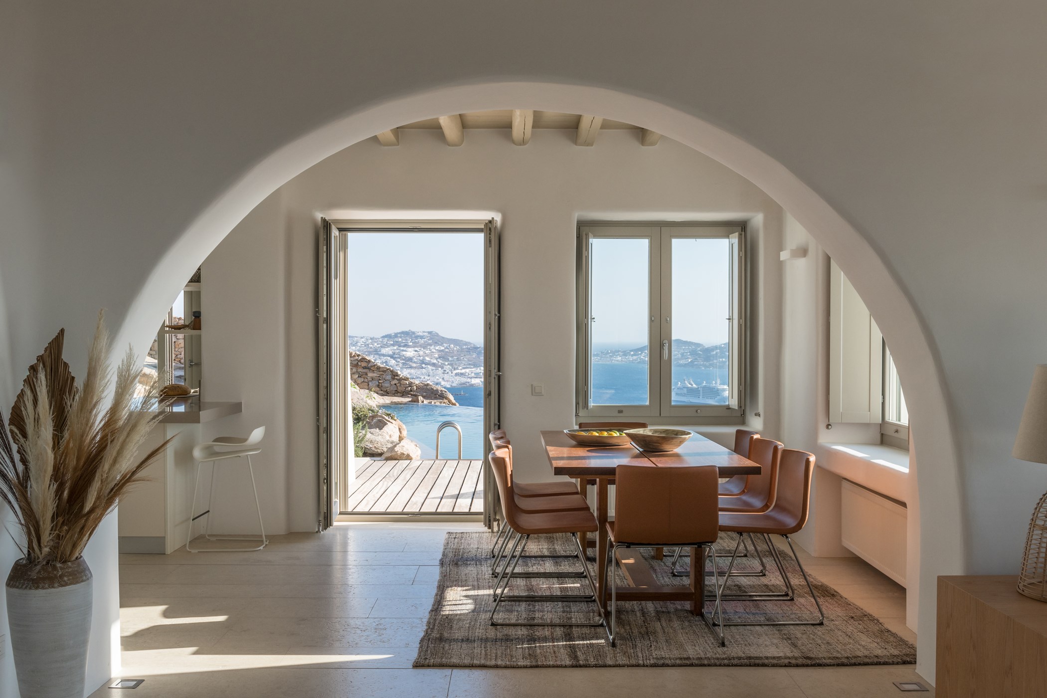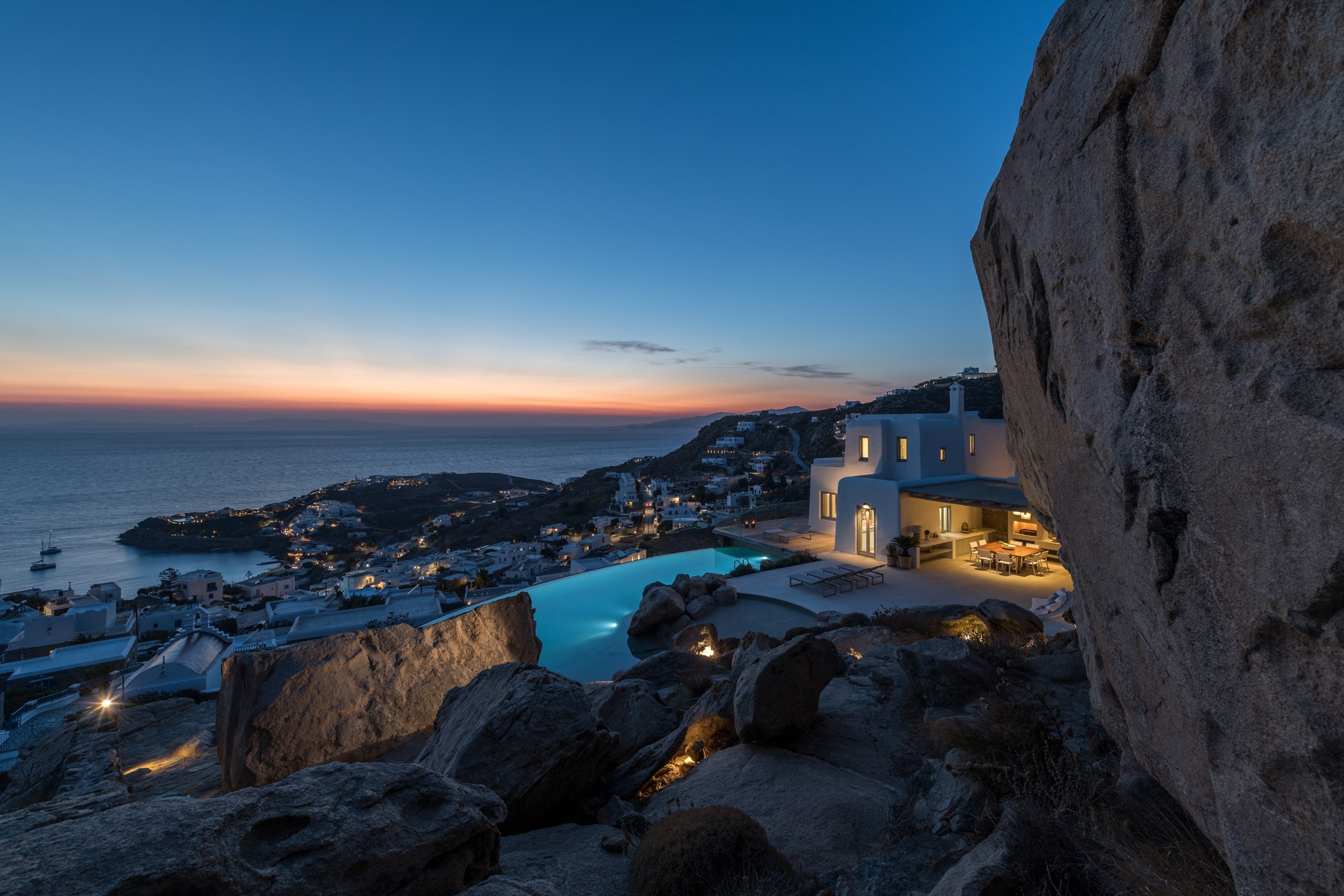 Nestled in Tourlos, Mykonos, Villa Roxi is a luxurious haven harmoniously integrated with the natural rock landscape. This exceptional property boasts breathtaking sea views, 7 en-suite bedrooms, a guest house, and a bright, open interior. Highlighted by a spectacular infinity pool overlooking the Aegean Sea, the villa is surrounded by a spacious terrace, perfect for relaxing and dining. Built into the rock, it offers a naturally cool and insulated environment, blending natural stone with modern design to create a tranquil atmosphere. Situated in a serene and quiet area, Villa Roxi provides an exclusive retreat while remaining conveniently close to Mykonos Town and pristine beaches, making it an ideal destination for those seeking both luxury and peace.